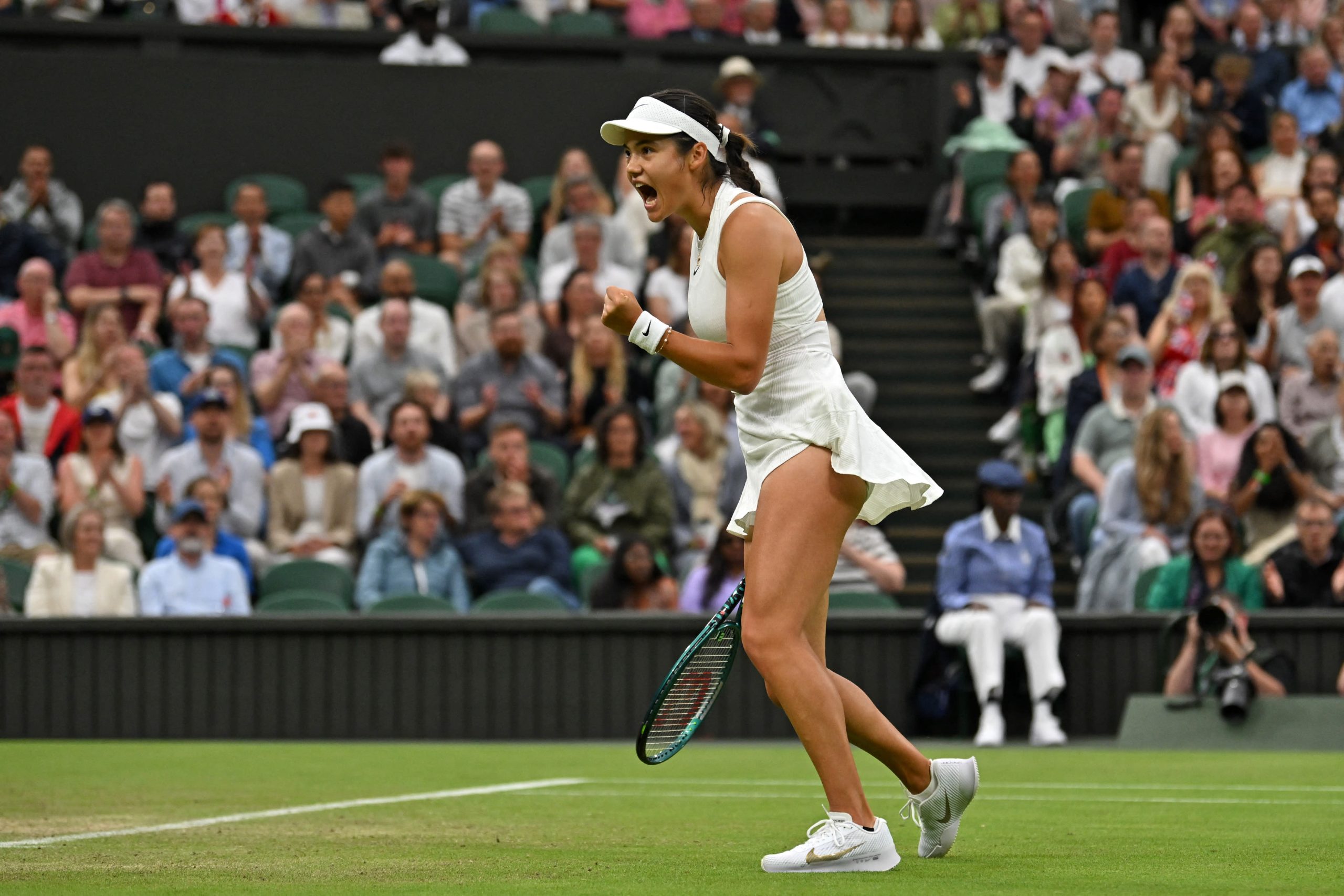 Raducanu, qui n’a en quelque sorte que 21 ans, nous a donné notre réponse vendredi, lorsqu’elle a écrasé la tête de série n°9, Maria Sakkari, 6-2, 6-3, devant un Centre Court bondé et bruyant – ou du moins bruyant à Wimbledon.